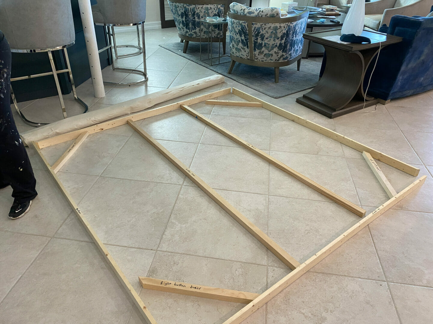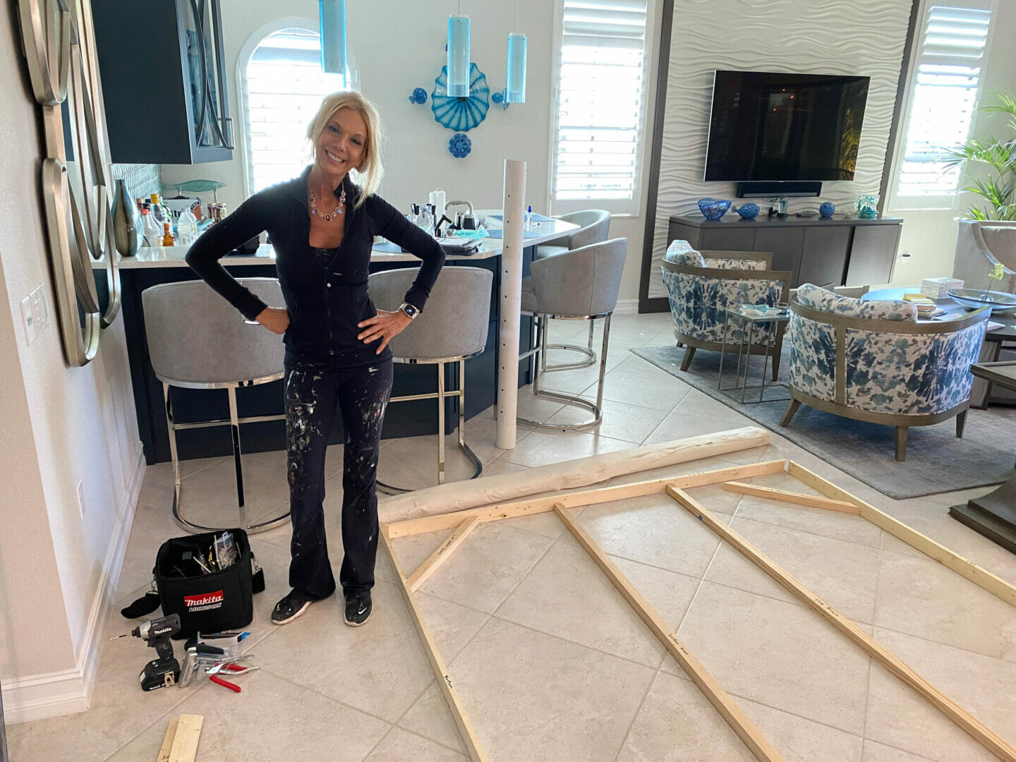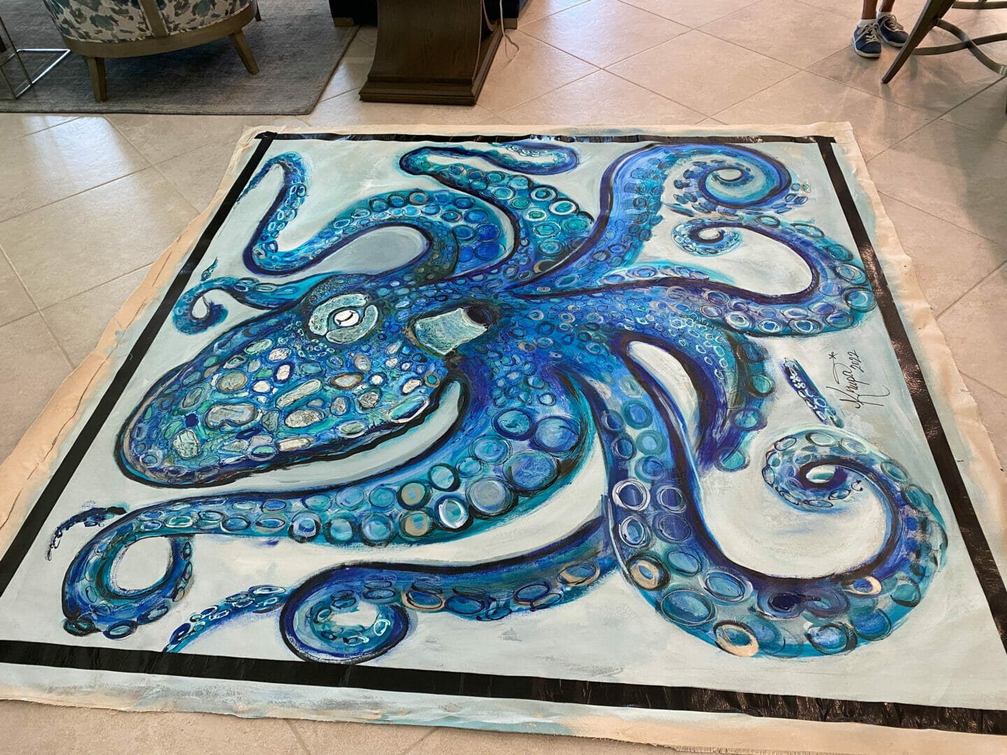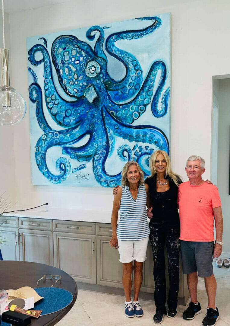 Great day today with Stacie Krupa!! I accompanied her to install a large commissioned piece of artwork. This beautiful creation is 7 ft x 7 ft so it had to be stretched and installed on location. These photos show it is very hard work to put the stretchers together, stretch the canvas and then install a large piece. But sure worth the effort. Octopus Boss Babe Par-tay Girl Reef Queen looks absolutely stunning in her new home. Congratulations and thank you to the new owners.