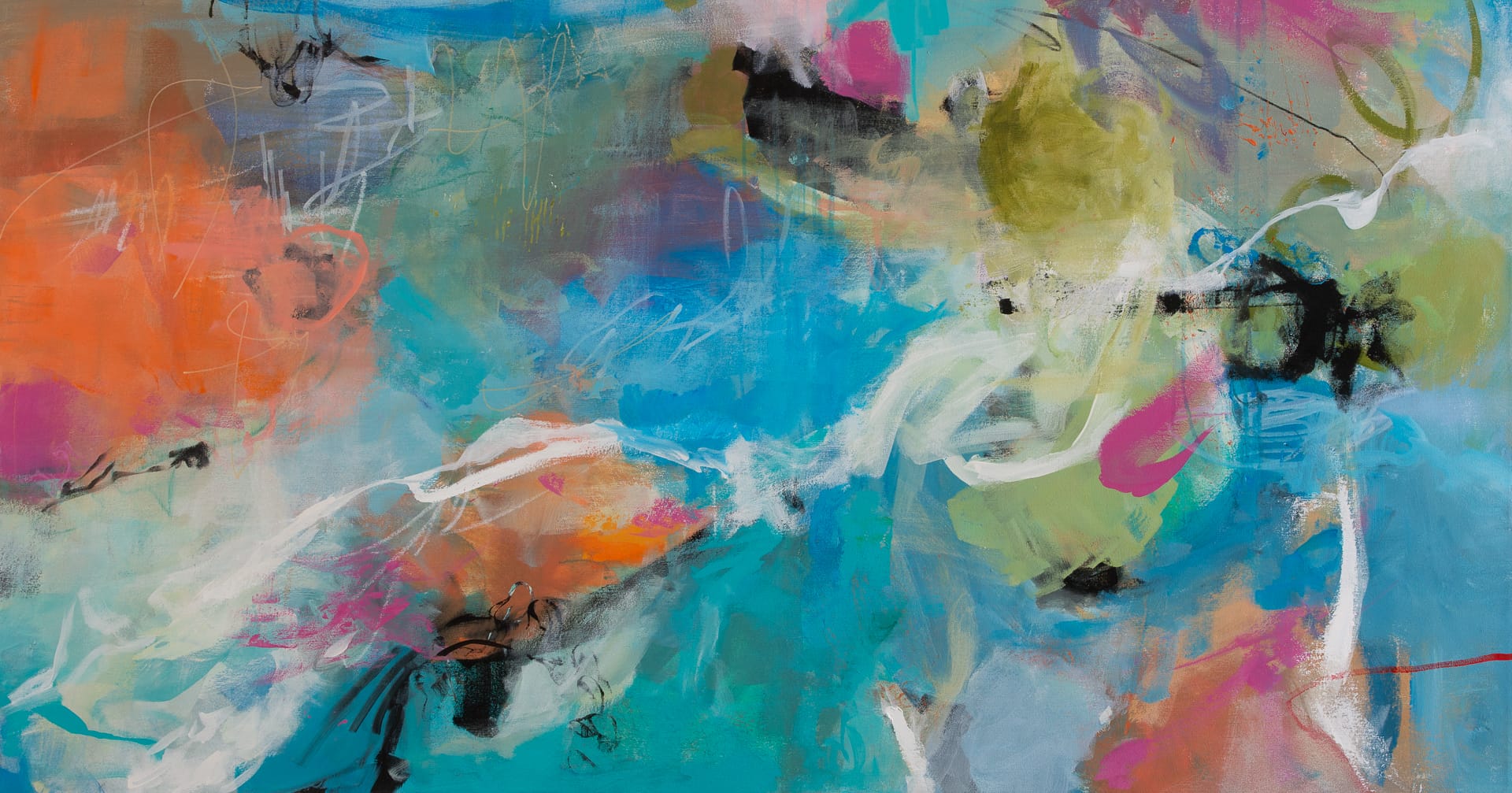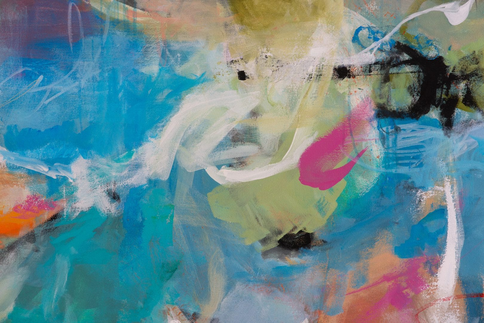 The swirling colors of teal, blue, orange, and greenish yellow come together in a harmonious dance, creating a sense of fluidity and motion that is truly mesmerizing. Each brushstroke and layer of paint adds depth and texture to the piece, inviting the viewer to get lost in its dynamic composition.