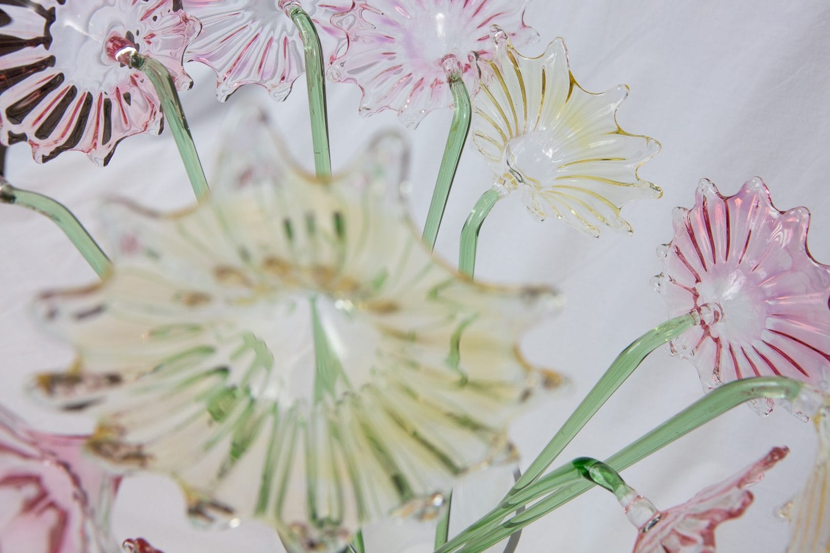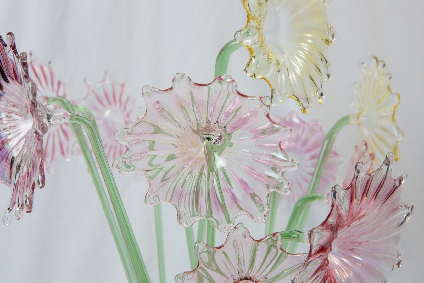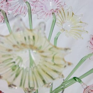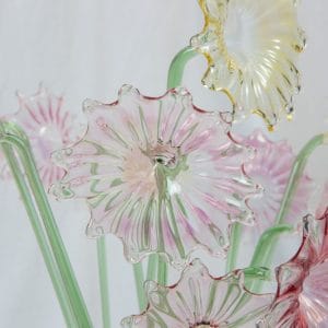 Let’s dive into the enchanting details of this masterpiece. Imagine a bouquet of twelve delicate flowers, each meticulously crafted from molten glass. The flowers, in a graceful combination of light pink and yellow hues, bloom effortlessly in a clear vase. Their slender green stems add a touch of nature’s vibrancy, perfectly contrasting with the delicate petals.