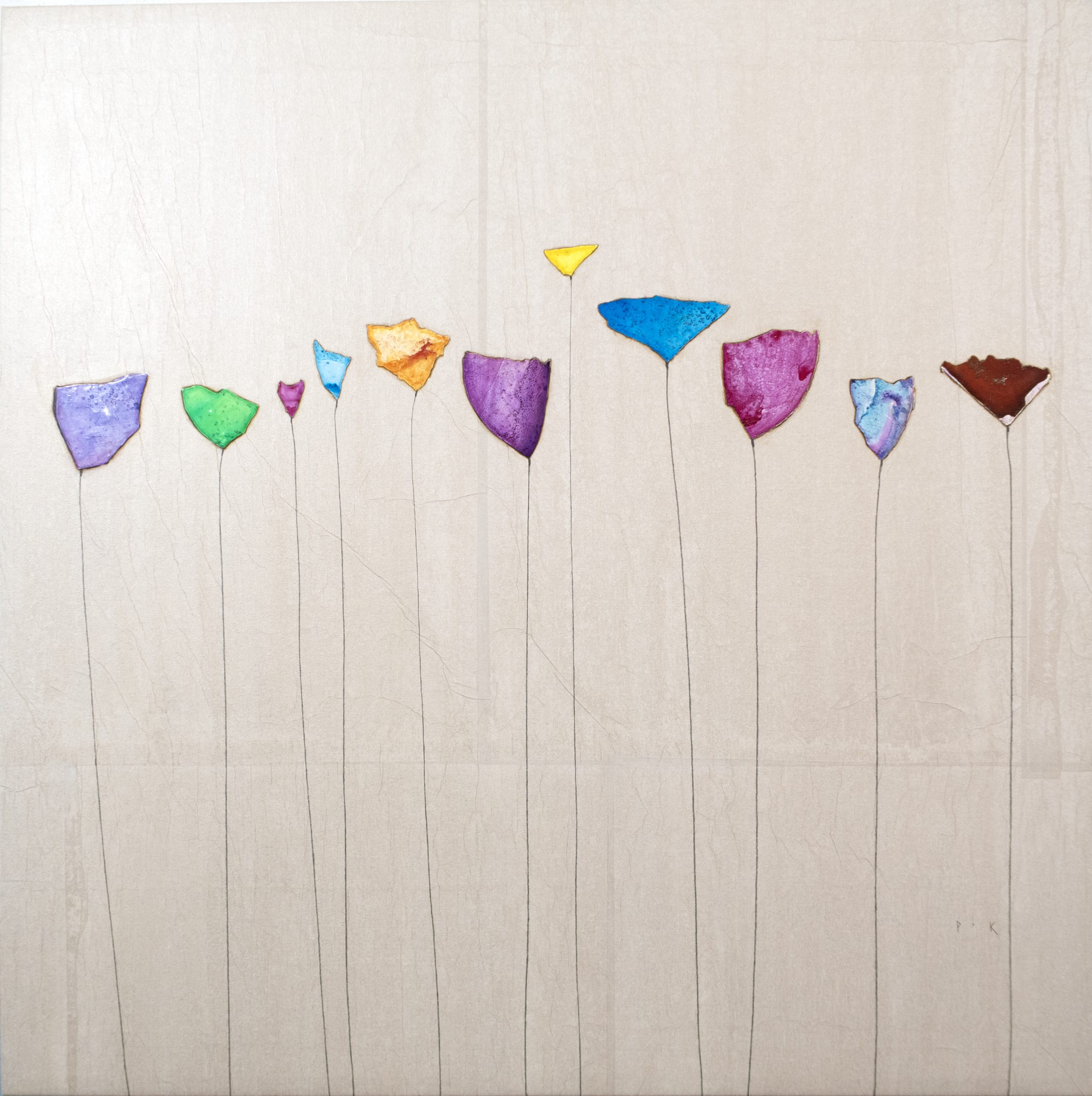 This eye-catching piece captures the spirit of the wild through a lively arrangement of abstract flowers, pushing the boundaries between natural and imaginative worlds. Kuttner’s approach to mixed media is all about layers — not just physical textures, but also emotional and visual ones. Look closely, and you’ll see how acrylics, perhaps some paper elements, and other unexpected materials work together to build depth and movement. The result is a painting that feels alive and in motion, much like the wildflowers it celebrates.